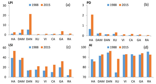 Four landscape indicators of the bays in 1988 and 2015. (a) largest patch index (LPI); (b) patch density (PD); (c) landscape shape index (LSI); (d) aggregation index (AI). Note: The abbreviations of bay names are explained as follows: Hai Loc Bay—HA; Dam Ha Trung Bay—DAM; Danang Bay—DAN; Xuan Dai Bay—XU; Vinh Van Phong Bay—VI; Cam Ranh Bay—CA; Ganh Rai Bay—GA; and Rạch Giá Bay—RA.
