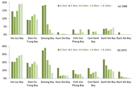 The proportions of construction land in each zone and each bay are shown in Figure 7. The results can be discussed in two ways according to the proportion of construction land. In the bays with high construction land density, the distributions of construction land in the five zones were similar in the two periods. The results suggested that the construction land expanded inside the zone. In Hai Loc Bay and Dam Ha Trung Bay, the distribution of construction land in each zone was relatively even. The built-up density in the inland zone was slightly greater than that in the seaward zone. In Danang Bay, the construction land was concentrated in the 0–2 km and 2–4 km zones in both 1988 and 2015. From the 4–6 km zone to the 6–8 km zone to the 8–10 km zone, the proportion of construction land decreased successively. Otherwise, in the bays with low construction land density, the distributions of construction land in the five zones in 2015 were different from the distributions in 1988. The rate of construction sprawl in the 0–2 km zone was obviously greater than that in the other zones. In the other zones, the construction land expanded randomly.