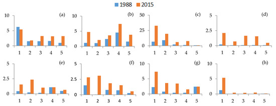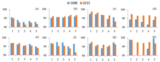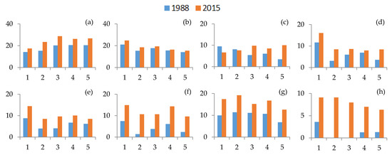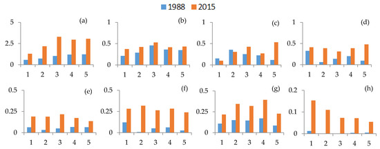 AIs of the bays in 1988 and 2015. (a) Hai Loc Bay; (b) Dam Ha Trung Bay; (c) Danang Bay; (d) Xuan Dai Bay; (e) Vinh Van Phong Bay; (f) Cam Ranh Bay; (g) Ganh Rai Bay; and (h) Rạch Giá Bay. Note: The abscissa values are explained as follows: 1: 0–2 km buffer; 2: 2–4 km buffer; 3: 4–6 km buffer; 4: 6–8 km buffer; and 5: 8–10 km buffer.