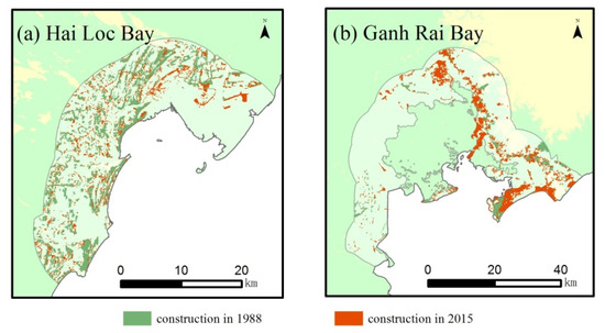 Spatial distribution of construction land in Hai Loc Bay and Ganh Rai Bay. (a) Hai Loc Bay; (b) Ganh Rai Bay.