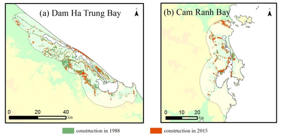 Spatial distribution of construction land in Dam Ha Trung Bay and Cam Ranh Bay. (a) Dam Ha Trung Bay; (b) Cam Ranh Bay.