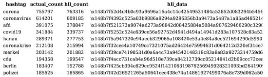 - Flajolet, P.; Fusy, É.; Gandouet, O.; Meunier, F. Hyperloglog: The analysis of a near-optimal cardinality estimation algorithm. In Proceedings of the Discrete Mathematics and Theoretical Computer Science, Dijon, France, 7–12 July 2007; pp. 137–156. [Google Scholar]