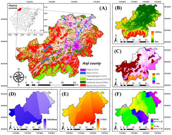 Anji County is located in northwest Zhejiang Province in China, ranging from 119°14′ E to 119°35′ E and from 30°23′ N to 30°53′ N (Figure 1A). The county has a total population of 470,700 and a gross domestic product of 40.43 billion yuan in 2018. It is surrounded by mountains on three sides, with a valley bottom plain in the middle. The terrain is high in the southwest and low in the northeast (Figure 1B). Its main drainage system is Xitiao River. Its climate is subtropical maritime monsoon. Data from 2014 showed that the annual total precipitation was 1370–1570 mm (Figure 1D), the annual average temperature was 17–18 °C (Figure 1E), and the annual average radiation reached 70–83 (Figure 1F), indicating sufficient sunlight, mild climate, abundant rainfall, and four distinct seasons. The soil types are mainly red soil, yellow soil, and lithological soil, among which red soil with a clay fraction of more than 40% has the largest area (Figure 1C). Anji County is rich in bamboo, covering an area of more than 60,000 hectares, accounting for more than 30% of the county’s area and more than 50% of the county’s forest area (Figure 1A).