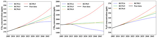 Future climate data for Anji County from 2019 to 2024 [38,44] were simulated under the representative concentration pathway (RCP) 2.4, 4.5, 6.0 and 8.5 scenarios proposed by the IPCC AR5 [45]. The concentrations of greenhouse gases such as CO2, CH4, and N2O under the four scenarios from 2004 to 2049 are shown in Figure 2, which suggests that RCP2.6 is the scenario with the lowest greenhouse gas emissions, RCP4.5 and RCP6.0 are the intermediate stability scenarios, and RCP8.5 is the high-emission scenario, with the highest and increasing greenhouse gas concentrations. Future climate data under the four scenarios include total annual precipitation, annual average temperature, annual average radiation, and annual average relative humidity, all of which were simulated with a resolution of 1°.