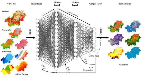 The input layer data of BPNN are derived from 21 variables, including land-use types, climate, topography, and other variables, which are shown in Table 1; thus, the number of input layer neurons is 21. For faster data processing and operation efficiency, the normalized function is used to map the input layer data in the range of 0 to 1. According to the empirical formula for the optimal number of hidden layer neurons and considering model conditions, the number of neurons in the first hidden layer is set to 30, and the number of neurons in the first hidden layer is set to 14. There are six land-use type categories in this study; thus, the number of output layer neurons is 6, and the activation function of the output layer is the sigmoid function to ensure that the probability values fall within [0,1].