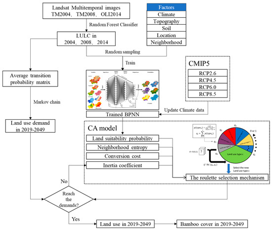 Anji County is the famous bamboo hometown of Zhejiang Province in China. In recent years, the area of bamboo forests in the county has continued to increase, and its impacts on forest types and carbon cycles have been a concern [39,40]. Therefore, based on past and current remote sensing information, this study takes Anji County as an example and uses the BPNN_CA_Markov coupling model to simulate the LUCC under the Representative Concentration Pathway (RCP) 2.6, 4.5, 6.0, and 8.5 (RCP2.6, 4.5, 6.0, 8.5) scenarios from 2024 to 2049. The objectives of our research are mainly as follows: (1) to build a Markov chain model to predict the land-use demand in the study area in a certain future period; (2) to construct a BPNN_CA model to deal with the complex competition and internal interactions between different land-use types to simulate the LUCC spatial patterns; (3) to couple the BPNN_CA model with the Markov model to simulate the spatial distribution map of land-use types that meet the quantitative demands. (4) to analyze the LUCC of Anji County under the background of climate change and reveal the impact of future climate change on the distribution of bamboo forests.