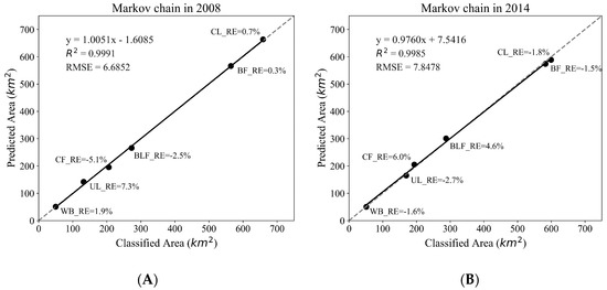 Based on the average transition probability matrix in Table 6, the land-use area demands in 2008 and 2014 are predicted. They were compared with the actual land-use classification areas in 2008 and 2014 to evaluate the prediction ability of the Markov chain model, as shown in Figure 6. The prediction area of land use obtained by using the average transition probability matrix had a high correlation with the actual classified area. The values between the classified area and the predicted area in 2008 and 2014 were both higher than 0.99, with the small RMSE values of 6.6852 and 7.8478 , respectively. The relative error of each land-use type in 2008 was in the range of 0.3% and 7.3%, and the relative error in 2014 ranged from 1.5% to 6.0%. Furthermore, the relative errors of BF in 2008 and 2014 were only 0.3% and 1.5%, respectively. This demonstrates that the Markov chain model based on the average transition probability matrix has a strong prediction ability with small errors, thus providing an important basis for the accurate area prediction of spatial bamboo forest distribution in the future.