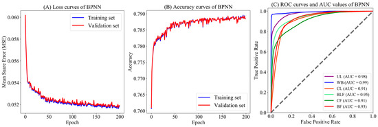 The mean square error (MSE) and accuracy of the BPNN optimization process are shown in Figure 7A,B, respectively. Figure 7A shows that the loss curves of the training set and the validation set decrease steadily until the epoch increases to 150–200, with the MSE value of the training set and the validation set stabilizing at approximately 0.052. Figure 7B shows that the accuracy curves of the training set and the validation set continue to rise with network training, and the curves finally reach a stable condition, with the accuracy stabilized between 0.785 and 0.79. The low MSE and high accuracy indicate that the network training optimization has no overfitting and has great generalization ability.