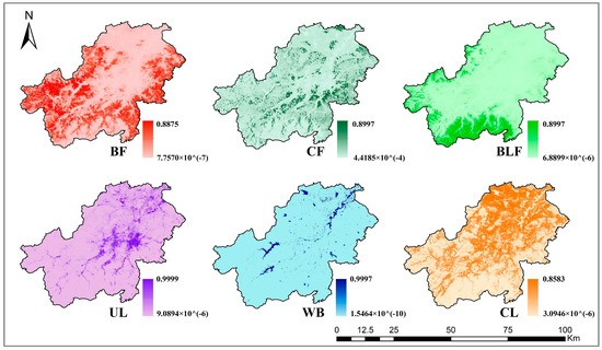 The land suitability probabilities of the six land-use types in 2008.