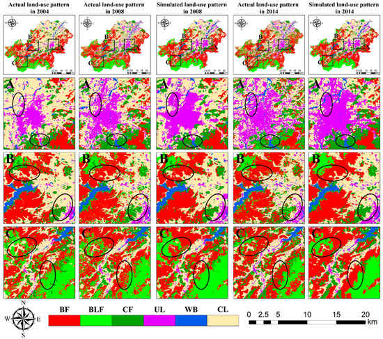 Based on the optimized BPNN_CA model and the land-use area demands established by the Markov chain, the simulated land-use patterns in Anji County in 2008 and 2014 were obtained, and more details are displayed in the three partial enlargements shown in Figure 9.