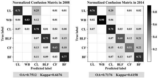 The confusion matrices of the land-use classification in 2004, 2008, and 2014.