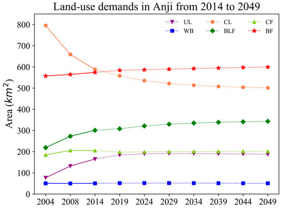 Since the land-use change amplitude of Anji County from 2004 to 2014 was relatively large and the change amplitude and dynamic value of each type in the two time periods from 2004 to 2008 and 2008 to 2014 were significantly different, the average transition probability matrix (Table 6) for the two time periods of 2004–2008 and 2008–2014 was calculated to simulate the area demand of each land-use type in subsequent years. The average transition probability matrix is related to the conversion cost in the CA model, and it also represents the difficulty of converting a land-use type to other types; thus, it is used as a reference for the optimization of the conversion cost. For example, in the average transition probability matrix, the transition from CL to BF easily occurs; thus, the conversion cost of CL to BF is adjusted to 0.5, which is lower than other conversion costs, so that the conversion of CL to BF is more likely to occur, which is reflected in the CA model.