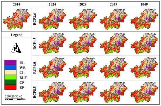 Figure 12 shows the spatial land-use patterns in 2024, 2029, 2039, and 2049 under four RCP climate scenarios. It can be generally seen from Figure 12 that the spatial and temporal distributions of land-use types in different years under the four RCP scenarios have similar characteristics to those observed in the past, indicating that the coupling model can accurately simulate and reveal the land-use evolution in the study area. Furthermore, the differences in land-use types from quantitative changes to spatial distributions in different scenarios and different years can be accurately presented. Therefore, the different changes in BF in different years under the four RCP scenarios can be obtained, as shown in Figure 13.
