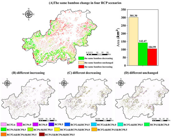 Figure 14 is used to further compare the different effects of four different climate scenarios on the spatiotemporal BF changes from 2014 to 2049. Figure 14A–D shows the intersection of and the difference in BF changes under the four RCP scenarios, demonstrating the different impacts. Figure 14A shows the regions with the same changes in the four RCP scenarios, and these changes can be divided into three categories: the same regions of BF remain unchanged, the same regions of BF are decreasing, and the same regions of BF are increasing. Figure 14B shows the different increase regions of BF in the four scenarios; Figure 14C shows the different decrease regions of BF in the four scenarios; and Figure 14D shows the different unchanged regions of BF in the four scenarios. The coupling model of this study simulates LUCC mainly through the internal competition of various land-use types and the influences of various driving factors on the land-use types. The land use and other driving factors to be input initially into the model are the same, but the input climate scenarios are different. Therefore, it can be considered that the same areas of bamboo forest-change in the four RCP scenarios (Figure 14A) are caused by the same internal land-use competition and other driving factors, while the three maps (Figure 14B–D) indicate the different impacts of different climate scenarios on the temporal and spatial distribution of BF in the future.