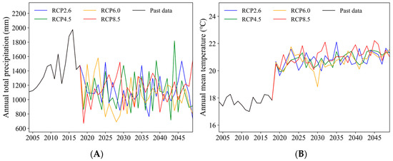 The annual total precipitation (A) and annual mean temperature (B) of Anji County under different climate scenarios from 2004 to 2049.