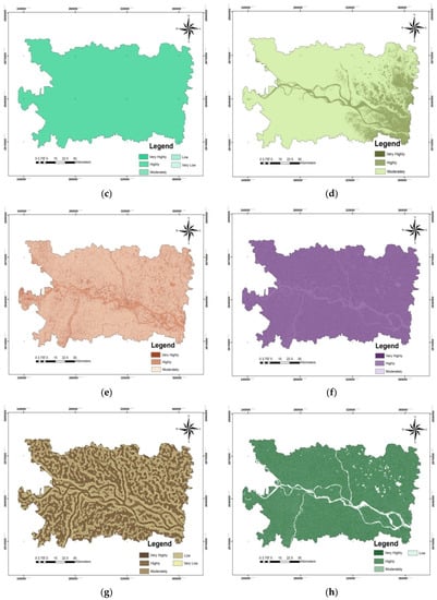 Basic parameters, such as precipitation rate, river density, drainage network, soil erodibility, and rainfall erosivity, and topographical variations, such as elevation, slope, and ruggedness index, were measured and evaluated for identifying flood-causing factors at river banks [14,24].