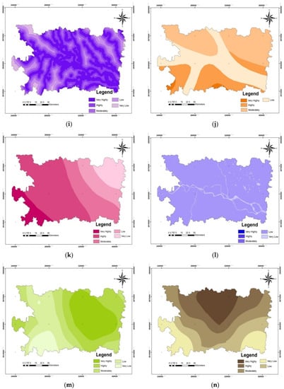 Flood susceptibility sub-criteria maps: (a) Precipitation, (b) river network density, (c) SPI, (d) elevation, (e) slope, (f) profile curvature, (g) landforms, (h) ruggedness index, (i) distance form river, (j) soil type, (k) soil moisture, (l) TWI, (m) soil erodibility factor, (n) rainfall erosivity factor, (o) LU/LC, (p) SAVI, (q) NDVI, (r) population density, (s) GMIS, (t) HBSE, and (u) distance to roads network.