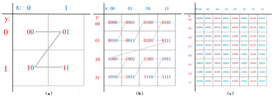 Space division based compression (SDC) incorporates ideas of Morton encoding and Geohash encoding. Morton encoding divides a two-dimensional geographic space into regular grids and each cell’s position represented by row and column is converted to one integer value resulted by bit interleaving operation of row and column numbers [34]. An advantage of Morton encoding is that neighboring grid cells in the two-dimension (2D) space is mapped into a one dimension (1D) linear sequencing order and keep the 2D neighboring relationship in 1D at variable resolutions. This encoding scheme is mostly used in quad-tree data model for spatial data indexing and raster data compression [32]. Geohash encoding follows a similar idea with Morton encoding. A unique property of Geohash encoding is that the encoded results at different resolutions share the same prefix. The implementation of Geohash encoding is conducted through an alternate spatial division vertically and horizontally. To implement a hierarchical space division and maintain advantages of both encoding strategies, a hybrid algorithm is designed and the basic idea can be demonstrated using an example below.