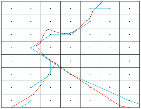 Under a certain resolution, multiple coordinate points may fall in one grid cell, and they have one identical binary code. For multiple nodes of one vector object, a grid filtering process is conducted to replace multiple coordinate points in a grid cell with the geometric center point of this cell, as shown in Figure 3.
