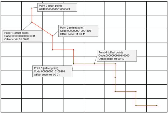 - Set up direction bit, calculate the offset direction of each coordinate point to its preceding point, Use “0” or “1” to represent left or right in horizontal direction, downward or upward in vertical direction, respectively.