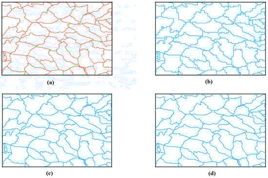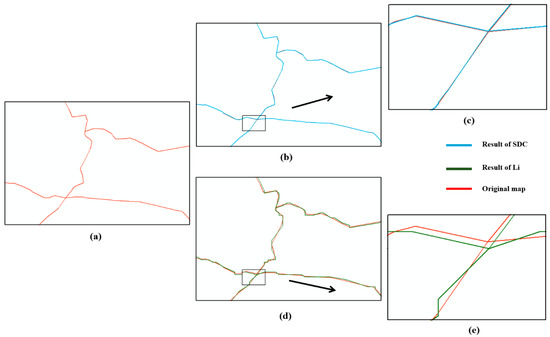 Overlaid results of maps at different scales. (a) is the original map at a scale of 1:100,000; (b) is the compression map at the scale of 1:100,000 using the new algorithm and n is 15. (c) is the compression map zooming to a scale of 1:25,000 using the new algorithm (d) is the compression map at the scale of 1:100,000 using Li’s method. (e) is the compression map zooming to a scale of 1:25,000 using Li’s method.