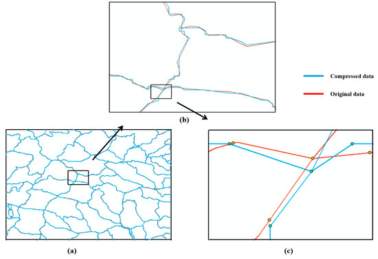 When the level of space division is 8 and 9, there are visual distortions in the compression results, which do not meet the requirement of visual lossless. When the number of divisions reaches 10, the compression result that can meet the visualization requirement at 1:1,000,000 as display scale can reach 97.18%. However, visual errors are obvious when the map is zoomed in, as shown in Figure 7, where the compressed result is overlaid with the original vector data