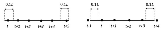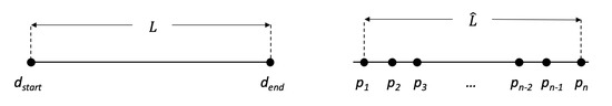 The first criterion requires that each car trace must be described by a continuous series of observations in time. Since the sample rate is 1 Hz, this means there must be one observation for each second between the timestamps of and . This can be expressed by condition C1: where and are the timestamps in seconds of and , respectively. The second criterion requires that and must be in the first or last 10% of the length l. This can be done using linear referencing where the position of p along l is . Therefore, the second condition C2 is: where is the position of p along l expressed as a proportion of L.