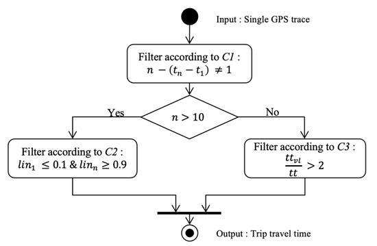 where is the travel time based on the mean speed v of GPS observations map-matched on l and the length L of l. Since C2 cannot be used to ensure and are close to the start and end of l; another criterion must be used. For that, the travel time calculated using Equation (2) can be compared to the travel time using Equation (3). The difference between the two should not be large. The purpose of converting travel time values from integer to non-integer is to have a more precise travel time. If the difference is large, that means a trip may have partially crossed l. For example, say there are three observations. With Equation (2), a travel time of two seconds would be calculated. If l = 100 m, and = 30 km/h, the travel time with Equation (3) is 12 s. As 12 > 2, observations must be missing. Using this, the new condition that must be met is C3: . A threshold value of two is selected as it empirically seemed to work well. It allows and to be different, but not too much. The link travel time calculation and filtering algorithm is summarized in Figure 3, and an example of the resulting travel times is depicted in Figure 4.