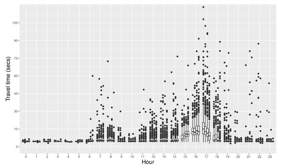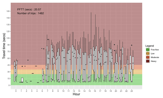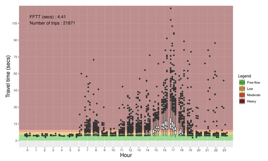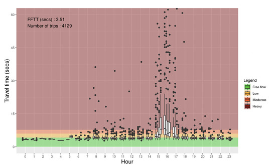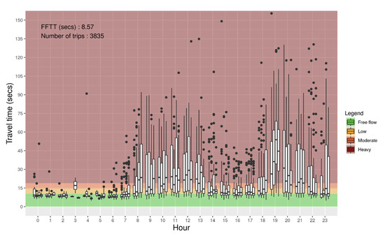 Figure 6 shows the distribution of travel times illustrated using boxplots as a function of the time of the day with intervals of 15 min for a link of Autoroute Félix-Leclerc in Quebec City. Colors in the background of the plot represent the congestion levels according to the TTI classes. FFTT is 4.41 s, and a total of 21,871 trips were used for this particular link. It can be seen that congestion occurs at the end of the afternoon. During the peak period, the median travel time reaches a heavy congestion level.