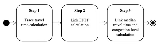 Step 1 (Algorithm 1) involves the calculation of trace travel times at the link level. The inputs are three months of GPS probe data excluding weekends and the road network (RN). Like in many papers [8,21], it is assumed traffic patterns are similar for days of the week, and that is why travel times are averaged together. All trace travel times are calculated based on the method presented in Figure 3. This is done for each direction of every link of the RN. The output data are trace travel times in seconds, with the following labels: hour h, quarter-hour q, night identification (whether in interval [22:00 p.m., 5:00 a.m.]) N, direction d, and link id.