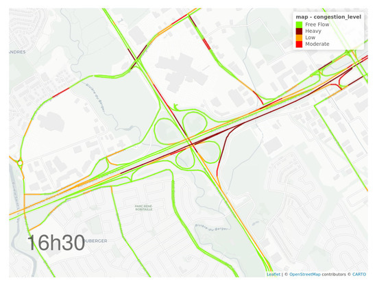Traffic map with model M at 16:30 p.m. over the junction of Aut. Félix-Leclerc and Aut. Robert-Bourassa, Quebec City.
