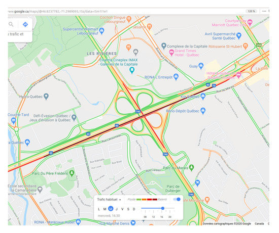 As was shown in the literature review, there is no ground truth for the number of classes, nor for the threshold values for each TTI class since these depend on the city for which the traffic model was developed. This represents a big challenge. Furthermore, the present model uses one set of TTI classes for a whole country for homogeneity purposes, which makes TTI classes’ validation with other models not really relevant. Still, a comparison could suggest if the choices made for the present model make sense or not. In line with the travel time validation presented next, Google Maps (GM) can be used. The colored links are a representation of the congestion levels that can be used for a map-to-map comparison. The purpose of this comparison is simply to spot some general traffic patterns like, for example, the location and moment at which heavy traffic occurs. It is important to use GM at a large scale, so that congestion location does not change because of cartographic generalization. It is also important to note that GM gives different maps depending on the day of the week. In our model (denoted M), all days of the week are averaged together. For a fair comparison, maps of a Wednesday are analyzed to represent a typical day of the week. To make use of the “historical” predictive model of Google Maps (not in real time), requests were made in the month of October 2020. More precision is given in the next section. Finally, it is understood that such qualitative comparisons have very limited validation power and that conclusions drawn from this should only assess whether the TTI classes are reasonable.