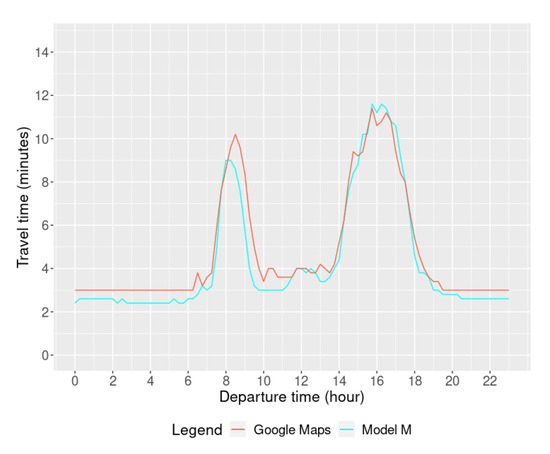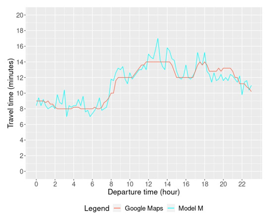 To validate the median travel times that were estimated for each link l and direction d, it is proposed to simulate routes going from an origin to a destination at given moments of the day on different types of roads according to the OSM highway types. Then, the calculated route travel times can be compared with those of GM, obtained by sending a request through the browser application [20]. This validation method has the following advantages. First, every route follows several road links of different types, which allows for the validation of a wide and diversified portion of the road network. Second, each route can be repeated to have departure times every 15 min of the day, which allows for a complete validation of the temporal coverage of the model on these routes, as much during congestion as during off peak periods.