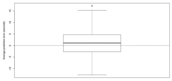 Performing the Wilcoxon test leads to a median prediction error of −0.16 min, which means model M underestimates route travel times by about 10 s compared to GM. The p-value is 0.007602, which is smaller than . Therefore, according to these results, both models are statistically different. However, it is important to note that the sample used in the statistical test has a size of 3632, which is pretty large, and it has enough power to detect very small differences. As has been mentioned in the validation method, this may not mean both models are that much different in practical terms. The other proposed validation test was performed. Prediction errors were calculated using random samples of 100 observations among the 3632 available, and the average prediction error was calculated. The 500 average prediction errors are plotted in a boxplot that is shown in Figure 14. It can be seen that the boxplot is fairly well distributed around zero and that the median average prediction error is 1.08 s. This test strongly suggests that in practice, both models yield similar travel time estimations.