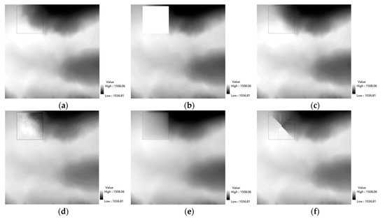 Based on the cut out DEM test set, 15 DEM data with gentle terrain and 10 DEM data with complex terrain were randomly selected for test verification. The extracted data are shown in Figure 5a and Figure 6a. The DEM data to be filled are shown in Figure 5b and Figure 6b. The given maximum size of the mask hole was 111 × 108, the number of data points to be filled was 11,988 pixels, the minimum size of the mask hole was 72 × 66 and the number of data points to be filled was 4752 pixels. For the DEM data with voids, the inverse distance weight (IDW) method, radial basis function (RBF) method, empirical Bayesian kriging (EBK) method, regular spline interpolation with tension (Rst), bicubic spline interpolation (Bicubic), Wasserstein GAN (WGAN) and the method in this paper were used to predict their missing elevation values.