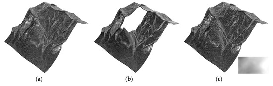 The digital elevation model (DEM) has wide applications and significant value in surveying and mapping [1], hydrology [2] and earth science [3]. As of now, the common way to obtain DEM data is by low-altitude photogrammetry, in which the point cloud data is obtained by dense matching. By covering a large scope of areas, this method can provide image texture information so as to basically meet the requirement of DEM construction [4]. However, due to a series of reasons, such as the dead angle of aerial photography, matching deviation and insufficient point position, the DEM constructed in most circumstances has holes of different sizes and shapes. The DEM data with holes hinders the acquisition of various terrain and geomorphic structure information, which would further make it difficult to provide and couple geospatial information well. For example, in the process of actual production, if the constructed high spatial resolution DEM has voids, it will produce an incomplete expression of the morphological characteristics of erosion trenches [5], while the missing data would also easily cause erroneous estimation of the material balance accuracy of mountain glaciers [6] and difficulties in eliminating topographic cracks [7].