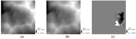 The above formula represents the product of the weight, calculated by the spatial proximity between each point and its central point , within a certain range of and the weight calculated by pixel value similarity. Through the convolution calculation, the DEM data were output. Finally, the obtained data were mapped to the repaired DEM data to eliminate the boundary effect.