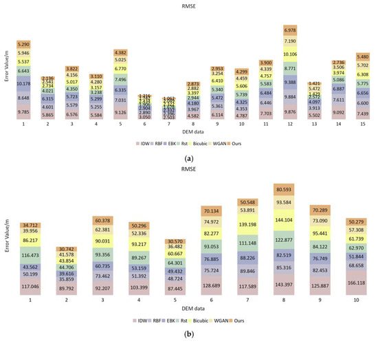 In order to make a fair comparison with the traditional method, this paper used the DEM filling results that had not been post-processed for comparative analysis. Figure 11 and Figure 12 show the objective comparative analysis of 15 groups of gentle test data, 10 groups of complex test data, 8 groups of Jiangsu province verification data and 8 groups of Sichuan province verification data after DEM filling by different methods and the method in this paper.