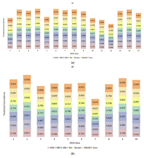 The RMSE was defined as the sum of the squares of the deviation between the observed value and the true value and the square root of the ratio of n to the number of observations to measure the deviation between the observed value and the true value. The smaller the RMSE value was, the closer the predicted elevation value was to the measured elevation value, and therefore the better the filling effect was. The closer the value of R2 was to 1, the higher the interpolation accuracy.