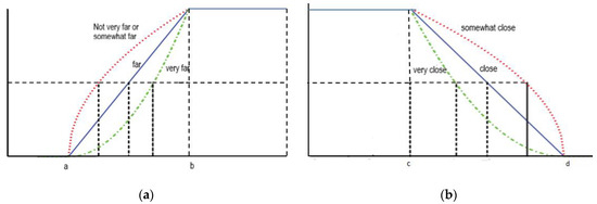 Among possible choices, linear membership functions such as triangular or trapezoidal shapes are simple to implement and fast for computation [35,36]; hence, we consider them as a first choice whenever found fit to represent a scenario. Moreover, a trapezoidal fuzzy number can capture the vagueness of those linguistic assessments (Figure 1). For example, a far linguistic variable for proximity or distance will be represented by a left-side trapezoidal (LST) fuzzy number for school, waterpoints suitability maps. Therefore, we propose: