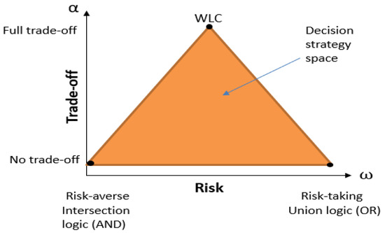 Subject to: These two measures: ORness (α) and dispersion (ω), allow one to determine the position of an OWA operation on the continuum between the extreme cases from AND and OR operators, as shown in Figure 3. Again, [43] suggests that the range of ORness values can measure a decision-maker’s attitude. Optimistic decision strategies take place from 0.5 to 1, and pessimistic plans are for values less than 0.5. In contrast, if the decision committee is neutral towards risk, they set ORness/Maxness value to 0.5. Therefore, OWA provides us with the capability to implement a wide range of different operations by choosing appropriate order weights.