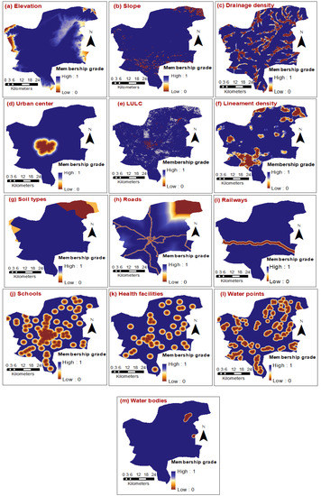Furthermore, fuzziness decreases away from locations with a higher possibility or existence of human settlement or activities. This aspect satisfies the condition that landfills cannot be placed near a human settlement area to protect the general public from potential health hazards [58]. Criteria maps representing this phenomenon include built-up, urban centers, schools, hospitals (health facilities), water distribution points, roads, and railways (Figure 4).
