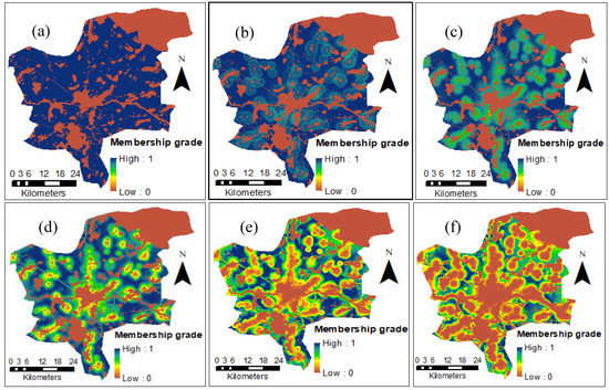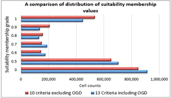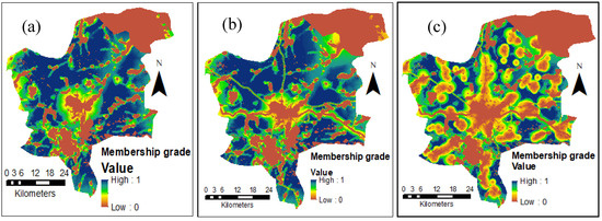 Figure 4 consists of 13 criteria maps derived from four main sources, as described in Table 1. We can observe a relative variation in a given map’s uncertainty increases with decreasing membership values. Therefore, areas with lower membership values are more uncertain (fuzzier) and vice versa. Membership grade values represent suitability values whose range is from 0 to 1.