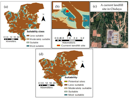 After this, we selected a few potential landfill sites that fall under the most suitable regions. The results were evaluated via Google earth map service system and ground survey method and found to be reliable. All 12 potential site locations (in Figure 6) were found to be far away from the restricted environments for landfill use. Furthermore, during the validation process, we also found out that the most recent landfill site in the city (Chidaya landfill) also falls under the most suitable area class for landfill sites in our final suitability map (Figure 6). Therefore, other areas marked as potential sites should be reserved for future landfill use as the city is expected to become one of the fastest-growing cities because of the relocation of government seats and its activities to this place.