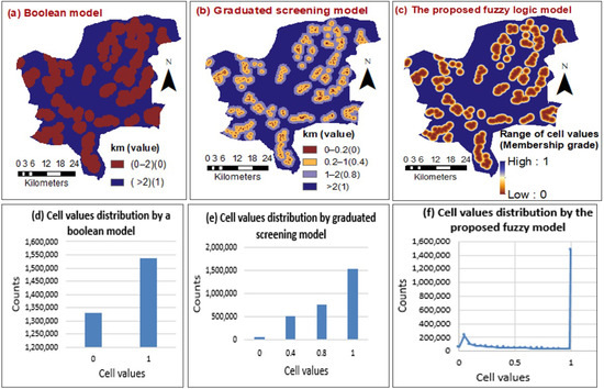 We interpret the suitability of a given location based on its membership value. According, to our proposed defuzzification procedure, areas that can be considered for further suitability analysis are those whose membership grade is greater than 0.5. The more the value is closer to 1, the more suitable it is. It can be observed in Figure 5a–f how the size of a suitable area decreases from (a) to (f) by increasing the value of parameter α. Among the alternative solutions, we choose a low-risk with minimum tradeoff probabilities. In addition, suggested suitability threshold values to include 0.998 for the best results (most suitable), 0.9 for the second-best results (suitable), 0.8 for the 3rd best results (moderately suitable), and so forth.
