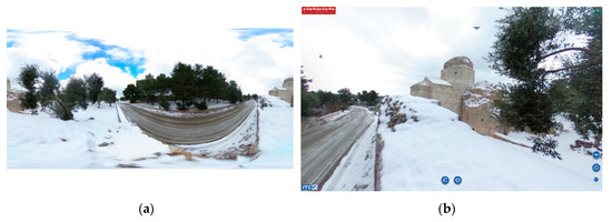 Exteriors of the church of San Felice (“Casale di Balsignano”): (a) Equirectangular image built via firmware using the two lenses Ricoh Teta S camera; (b) Virtual tour scene based on the aforementioned equirectangular image.