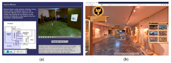 Isparta Museum Virtual Tour. (a) The interface shows a floor plan window on the left and a viewing window on the right; pull-down menu described in [13] seems absent; (b) the new interface version available nowadays [14] seems not to adopt usability assessment suggestions; moreover, the floor plan and the hotspots on the artifacts have been canceled.