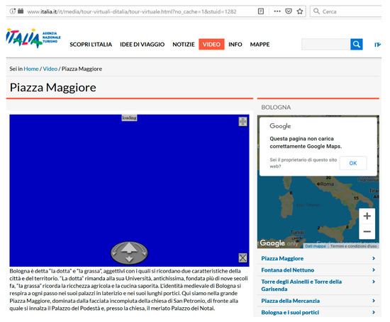 Now, the interface presents problems that hinders both the consultation of the virtual tour (only using Firefox browser) and its location on the map, as in Figure 4, for “Piazza Maggiore” [20].