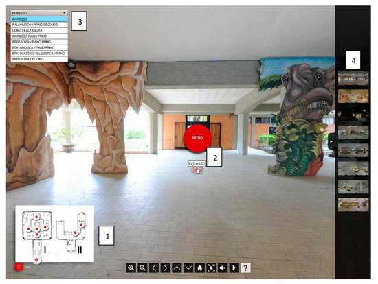 Among the Italian museums, the virtual tour interface (Figure A8) created for the “Union of Italian Jewish Communities” [30] is interesting with respect to several features: