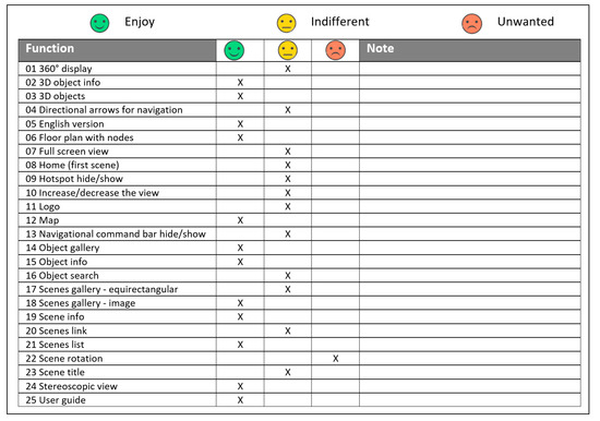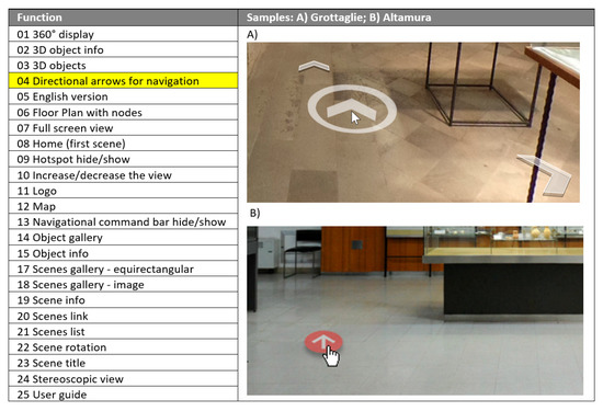 More recently, a study aimed at establishing which information allows the virtual tour user to feel as if they were actually in the real environment—therefore increasing effectiveness and usability—was conducted with the involvement of 20 universities, local and foreign [15], using the interview method. The results can be summarized as follows: (a) menu easy to find and not complicated; (b) navigation easy to access and use; (c) interaction using floor plan with hotspot; (d) availability of a tour guide avatar and audio help; (e) compatibility with both desktop and mobile.
